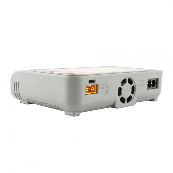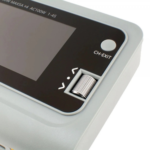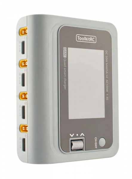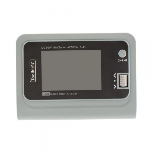 ToolkitRC Q4AC — четырехканальное зарядное устройство для Li-Po (1-4 банок), NiMh (1-10 банок) и Pb (1-8 банок) . Имеет встроенный блок питания на 100 Вт (можно запитывать от сети 220 В) и входной порт для постоянного тока до 200 Вт.