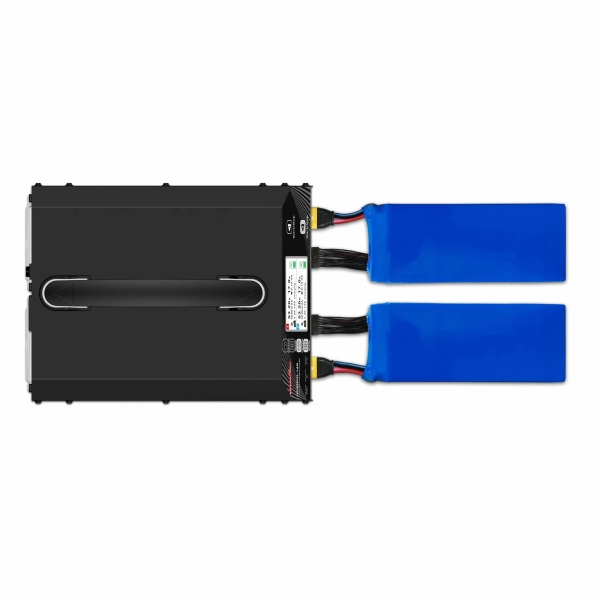 - два порта зарядки сумарной мощностью 2000 Вт позволяет заряжать сразу два аккумулятора с количеством ячеек от 6 до 14S;