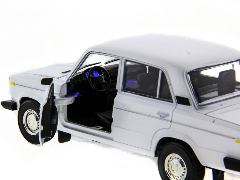 Модель изготовлена из металла с элементами пластика. У нее открываются двери, капот и вращаются колеса. Кроме того, игрушка оснащена инерционным механизмом, а также световыми и звуковыми эффектами (загораются фары и слышится звук открывания дверей), что делает игровой процесс еще более захватывающим. Машинка ВАЗ 2106 имеет три варианта расцветки.