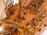 Набор линкора San Juan Nepomuceno, как и большинство аналогов из серииAL22хххх, не назовешь легко собираемым, хотя для опытного моделиста все операции, в общем-то, стандартны. Корпус складывается из готовых, вырезанных лазером шпангоутов и киля. Настил палуб идет по верхним краям шпангоутов, причем для достоверности можно сымитировать конопатку. Из 2 пакетов темно-ореховых реек, предоставляемых с явным запасом, оборудуется обшивка. Заготовки для мачт также выполнены из темного ореха. В 4 коробочках-кассетах расфасована масса деревянной, металлической точеной и литой мелочевки: блоки, юферсы, балясины, декор, пушки и шарики-ядра, штурвальные колеса и якоря, судовой колокол и т.д.