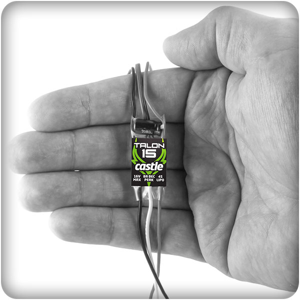 Фирма Castle Creations славится бескомпромиссным качеством своей электроники. Выбирая регуляторы данной фирмы, вы обеспечите своей модели отличную энерговооруженность, эффективность и надежность. Регулятор оборотов Castle Creations Регулятор оборотов Castle Creations Talon 15 разработан специально для моделей вертолетов 250-го класса (высоковольтный сетап), а также для небольших паркфлаеров. Питание 2-6S LI-PO, максимальный продолжительный ток 25 А. Обладает самым мощным в своём классе BEC: продолжительный ток - 3А, пиковый - до 8А!