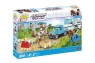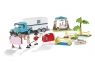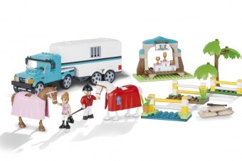 Пластиковый конструктор Трейлер для перевозки животных с двумя фигурками людей и двумя фигурками лошадей.