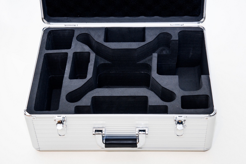 Внутри кейса уже вырезаны места для безопасного хранения квадрокоптера с установленными пропеллерами, запасных батарей, зарядного устройства, передатчика и другого дополнительного оборудования.