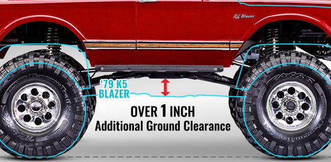 Благодаря радикальной конструкции портальных осей TRX-4, карданные валы расположены выше, что улучшает геометрию оси и уменьшает углы поворота карданных валов. Более высокие карданные валы и тяги подвески преодолевают препятствия, что позволяет избежать высокой центровки вашего грузовика и снизить общий износ.