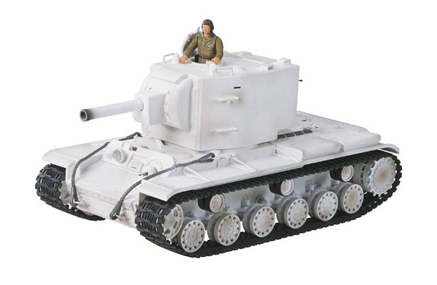 Радиоуправляемая модель тяжелого штурмового советского танка времен второй мировой КВ-2 в зимнем камуфляже. Модель детально копирует свой прототип. Управление осуществляется каждой гусеницей отдельно, поворотом башни и подъемом пушки, а также танк оборудован пневматической пушкой, стреляющей пластиковыми шариками.